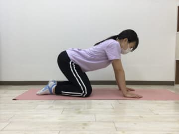 - 四つん這いになり、ゆっくりと息を吐きながら背中を高く持ち上げるイメージで丸める