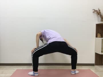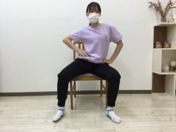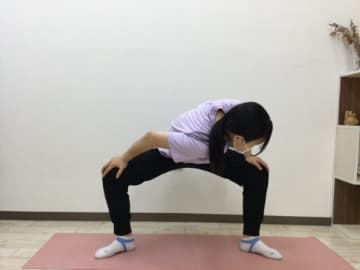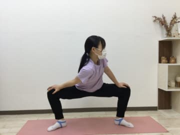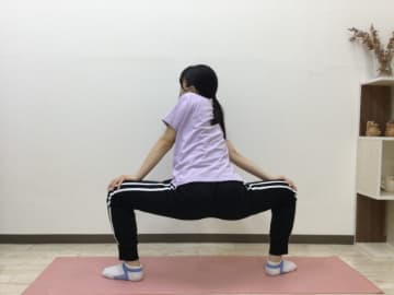 - つま先を外側に向け両足を広げ、膝を軽く曲げ、膝に手を当て腰を落とす