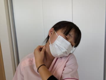 ①首を横に傾け首筋の筋肉を上から下に軽く揉みほぐす