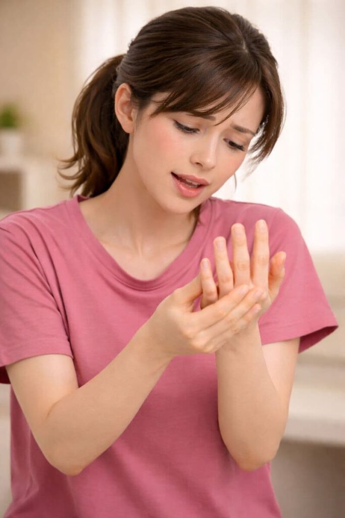 ばね指の場合は、指を曲げ伸ばしする際、『ガクン』と引っ掛かるような感じや、指が跳ねる現象が起こります。