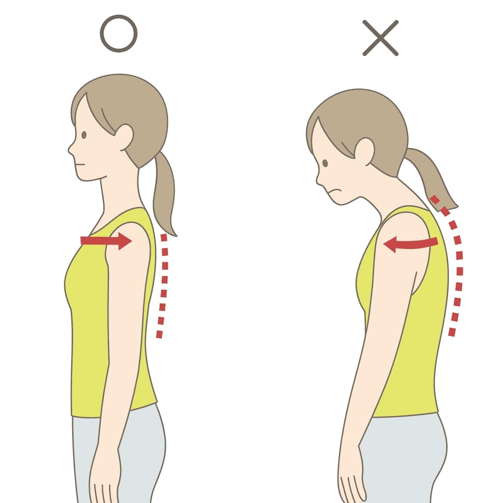 背中が丸くなると首が前に突き出し、頭の重さが首〜肩に集中します。
